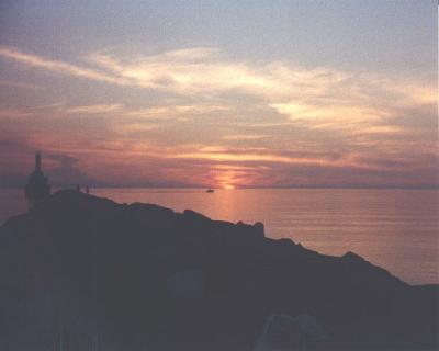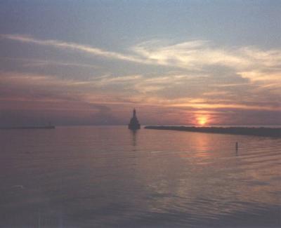 Sunset over the west breakwater of the northern canal entry. The silhouette in the center is the lighthouse that guards the entry. |