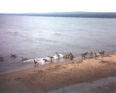 | A flock of Canadian geese relax on the beach of McLain S.P.. |