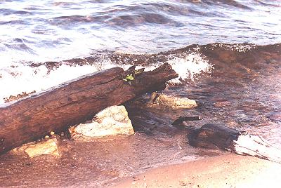 A picture on the beach at the Bay Furnace location. If you'll notice closely, in the lower piece of wood there is a metal spike. That suggests to me that it is either remnants of a support structure for the furnace (a dock maybe?) or a piece of an old shipwreck. Probably the former though since the timber is still round, not hewn. |