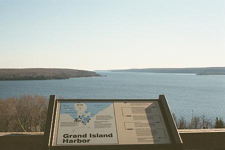*Photo overlooking Grand Island Harbor from the roadside park up on the bluffs west of Munising. Taken early May 2002. The land accross the water and on the left is Grand Island. There is a lighthouse standing on it's rightmost tip that you'll see later. I have a picture of it taken from this vantage point with my 500mm lens, but it's just not very attractive. |
