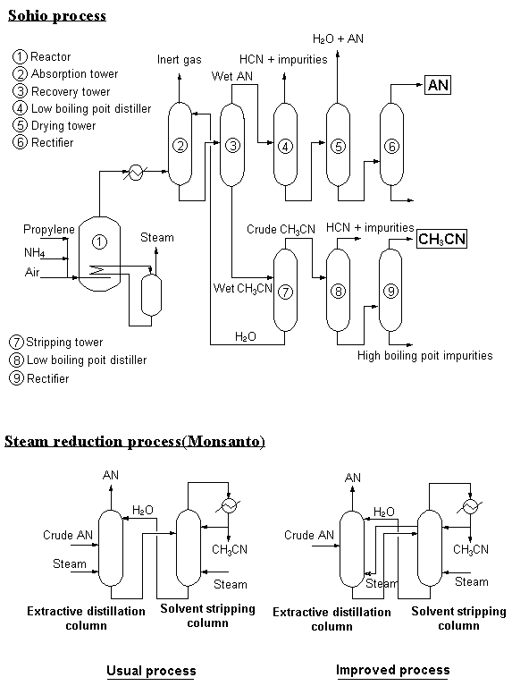 Monsanto Corp. improved the water extractive distillation stage of the Sohio process, reducing the amount of steam required to produce one ton of AN by three tons.