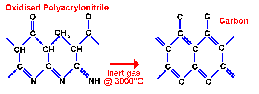 CARBONISATION(GRAPHITISATION) involves heating the fibers up to 3000 � C in an inert atmosphere, the fibers are now nearly 100 % carbon.