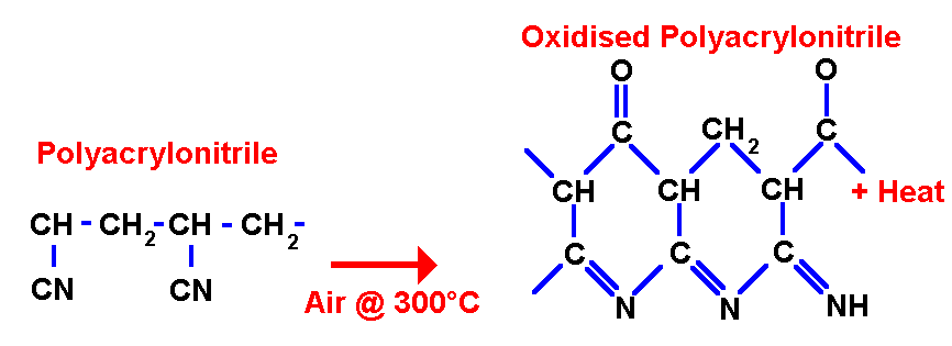 • OXIDATION involves heating the fibers to around 300 deg C in air. This evolves hydrogen from the fibers and adds less volatile oxygen.