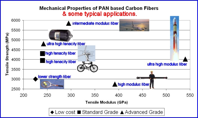 PITCH based carbon fibers have lower mechanical properties and are therfore rarely used in critical structural applications.PAN based carbon fibers are under continual development and are used in composites to make materials of great strength and lightness