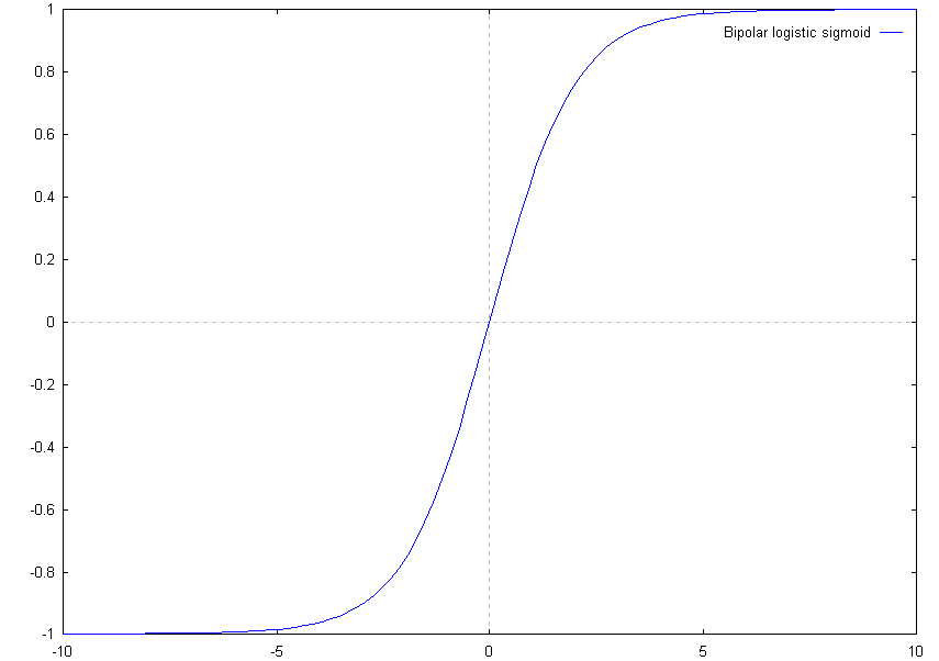 Every node can have its own activation function, however generally only two activation functions are used in a particular network. The input layer and sometimes the output layer use the identity function. When the output layer does not use the identity function, it will probably use the same activation function as the hidden layers. The hidden layers use any differentiable, non-linear function. Why? If the hidden layers use a linear activation function, their ability to produce categories that are not linearly separable is lost. If the function is not differentiable, you cannot apply the training algorithm used for back propagation networks. The most common activation functions used for the hidden layers and output layers are the binary or bipolar logistic sigmoid. To gain an understanding of what these functions do, it is convenient to look at their graphs. The graphs for both functions are as follows.