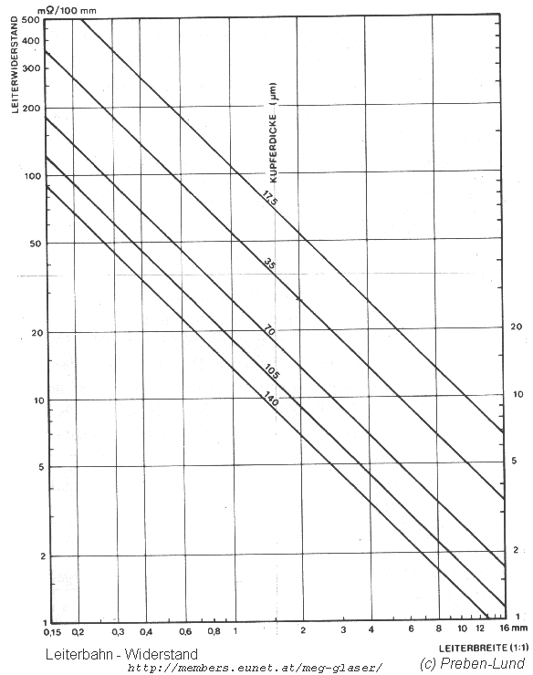 Widerstand der Leiterbahn, abhängig von Cu-Dicke und Breite.