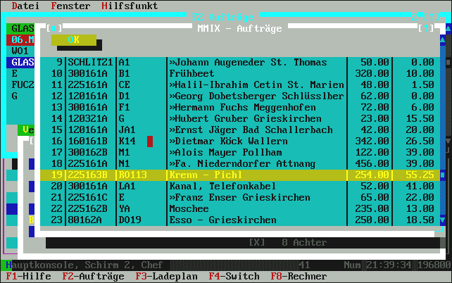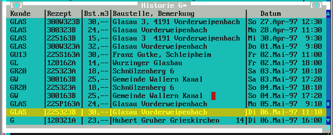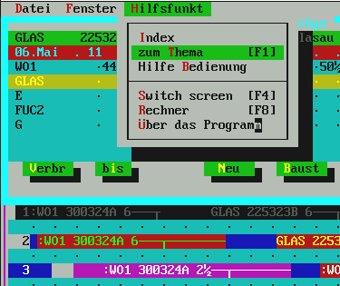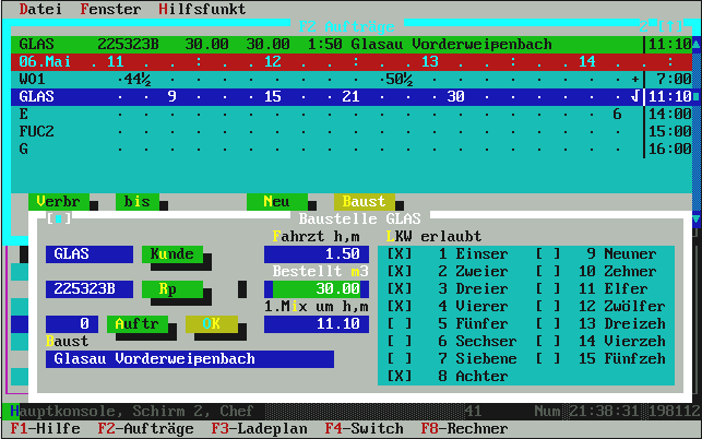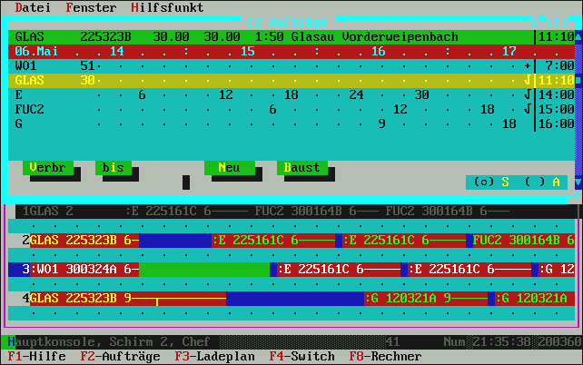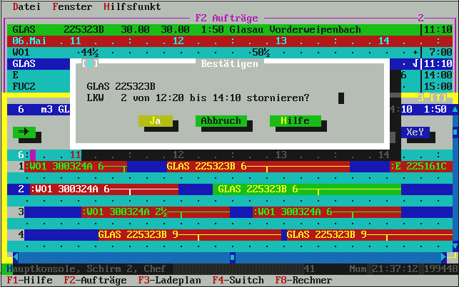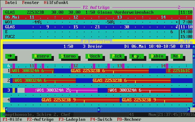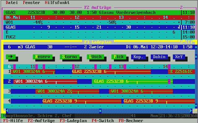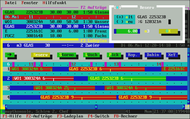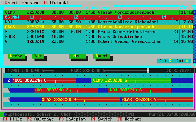 mehr als laut Auftragsbestellmenge noch zur Restlieferung gebraucht wird. Normalerweise genügt hier also einfach die [Enter]-Taste für OK und damit wird die Fuhre im Ladeplan eingetragen. Übrigens: in der oberen Zeile, wo die Uhrzeit-Leiste dargestellt ist, sehen Sie die Belegung der Mischanlage mit lila Kästchen angezeigt. Die Liste zeigt (je nach Fenstergröße) ca. 4-6 LKW aus beliebig vielen. Das ist ein Roll-Fenster. |
