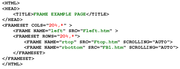 The * in the "rows" parameter allows the browser to assign whatever space is left. For the two row elements, the first row (called Right Top below) will get 20% of the space while the second, Right Bottom, will get the remainder of the space. If you specify *,*, each row will get half the space.So, you can also specify PERCENT OF WIDTH, NUMBER OF PIXELS, or * to assign the amount of space you want for a frame row or column.