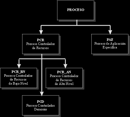 Estos procesos están asociados a un recurso del que disponga la máquina. Sólo este proceso controlador tendrá acceso a este recurso, y por lo tanto sólo él lo podrá administrarlo. De manera que si algún proceso necesita tener acceso, a dicho recurso del sistema, deberá llevar a cabo la petición pertinente al administrador del recurso, y esperar la respuesta de éste si fuera necesaria, para actuar sobre él. Dicho esto, resta comentar que necesariamente, los procesos de este tipo van a soportar al menos dos llamadas, y éstas dos son obligatorias, que son DAR_RECURSO_A_PROCESO, en respuesta a la petición de recurso de un proceso al PCR, y DEVOLVER_RECURSO_A_SISTEMA, como devolución de un recurso al sistema por parte de un proceso, una vez que lo ha consumido, ha terminado de trabajar con él o termina la vida de dicho proceso.