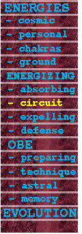 It is the conscious control of the energy flux within the body from feet to head and vice versa. The practitioner's wish is fundamental in order to establish the intensity, velocity and timing of the closed circuit of energies. The image shows the direction of the enegy's flux. There are many benefits in the closed circuit, among them we can list: - Intense Vibrations - it is a state in witch the practitioner accelerates the flux of energies towards a maximum intensity what may allow the occurrence of an Out of the Body Experience through the astral body that escapes from the low vibrations of the physical body; - Well Feeling - mental and physical and allowing the practitioner to be more sensible during the situations of a |
