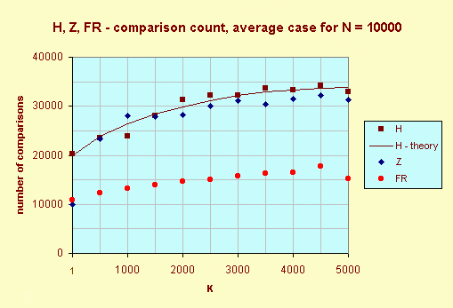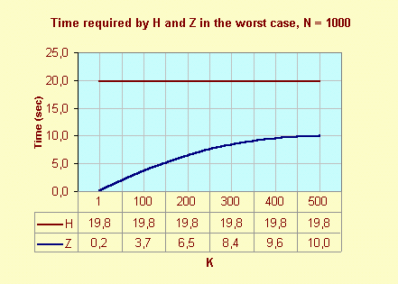In worst case the number of comparison for the algorithm H doesn't depend on K. But for the algorithm Z the number of comparison depends on K. The following graph shows the time of execution H and Z in worst case.