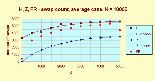 The graph H, Z, FR - swap count, average case shows that Z has the least count of swaps. It shows that my estimate for S(N, K) for Z holds as well as.