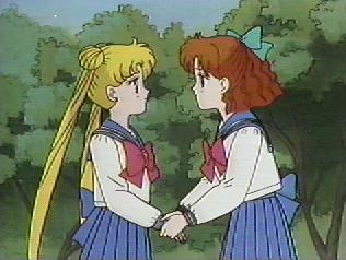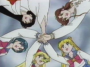 | "Wait!" All the girls were surprised because Amy had interrupted. "Thanks for everything. I wish we could go out for dessert once more. Sorry, but I wanted to say it just in case something happens". | "Ami?" The other girls were somber at first. Then Lita said "Alright, let's go fight for peace, then for dessert". The other girls chimed in "For Rini and the future Crystal Tokyo" | The girls joined hands. "To save our beloved Earth!" |