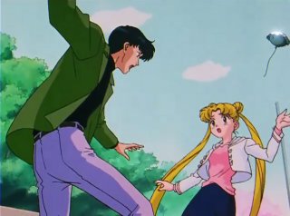 "Darien! You're not listening to me at all!" Darien suddenly leaned forward grasping his head as if in pain. When Serena tried to get close to him, he slapped her hand away. Serena's balloon floated off into the sky. |