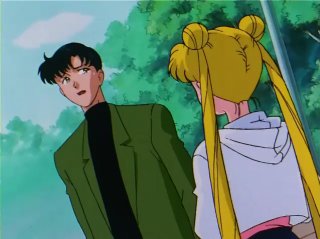something. "Now that I'm in high school," she was murmuring, "I think our relationship should be more... I mean... you know... I wouldn't mind if you..." Serena paused. Darien didn't seem to be paying attention. |