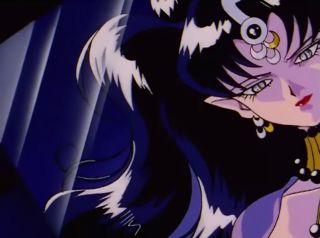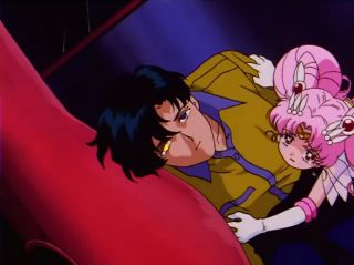 Mini-Moon. "Do you hate me?" Nehelenia's voice floated lazily through the room. Sailor Saturn stood on guard. "Use your hate to kill me but the curse will still remain," laughed Nehelenia. Sailor Mini-Moon continued to encourage Darien. "If this continues, I'll disappear...". Sailor Mini Moon began to cry. |