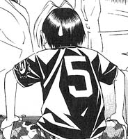 volume 5, page 27 I find this to be the least offensive of the go shirts because the five on it is fairly small and there's nothing else really odd about it. I wouldn't even have noticed this shirt if he didn't ALWAYS WEAR SHIRTS WITH THE NUMBER FIVE ON THEM.