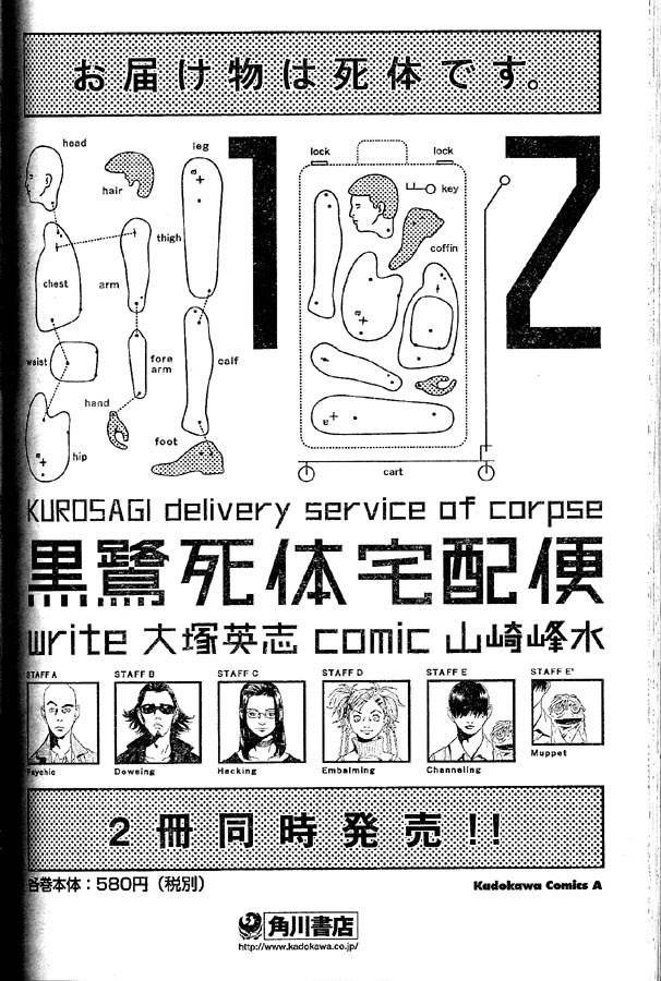 Anyways, outdoing themselves. The japanese never cease to amaze me with their ability to produce fubar. I found this ad for a manga in the back of my February Asuka and wow is it special. Not only does the engrish say "KUROSAGI delivery service of corpses" but one of the characters (staff E') is listed as "muppet". Wow, it's just so special.