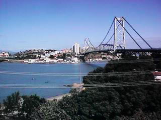 大陸と島との間には2本の橋があります。一方は写真の吊り橋で70年程前に架けられて老朽化が進み現在は補修作業中でした。もう一本は片側4車線在る橋で街の両側の交通の大動脈となっています。