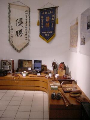 展示されている中央に立派な神輿がありました。この史料館をとりまとめた谷川さんの話では、当初は盗難・紛失を恐れて出来るだけケースに収納しようと意見が強かったが、小物を除いてそのまま展示するようにしたと説明していました。