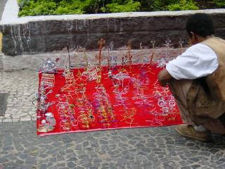 サンパウロの散策でもう一つの楽しみは路上のお店です。もう様々なものが売られています。小さな針金で作った「自転車」を販売している人がいました。