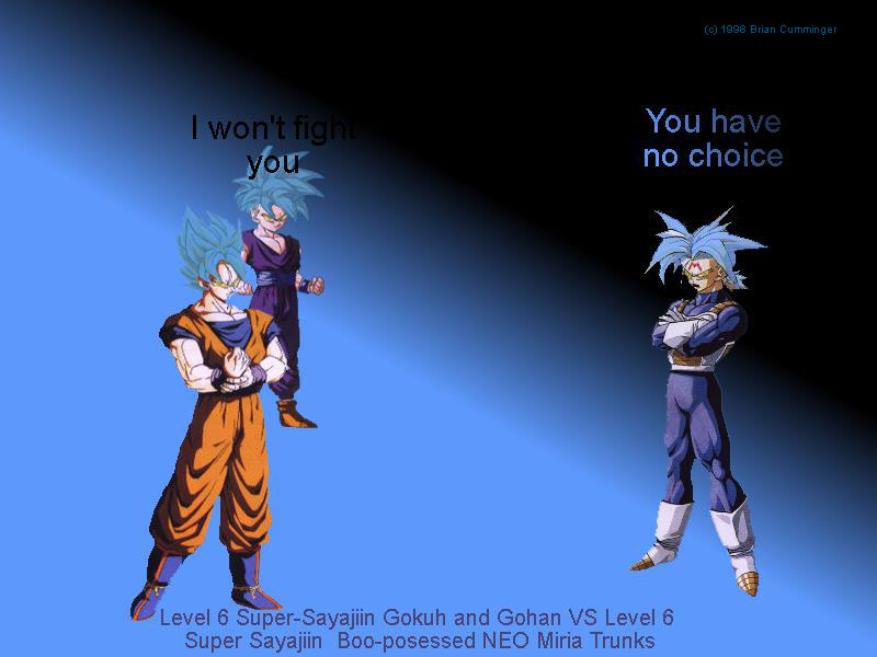 "Yet another Dbz Image. This is my first rendition of a Level 6 super-sayajin majin buu-possesed trunks vs a Level 6 super-sayajin gokou and gohan. Fair bit of work. Eye and Hair color changed, the planet (yes, that's a planet) is just a gradient and no stars."