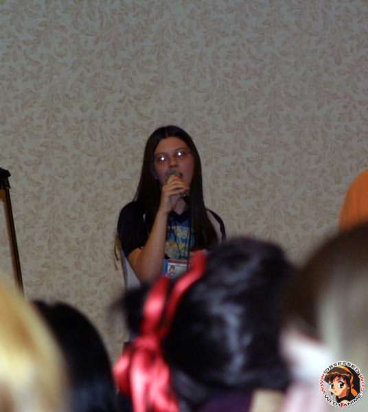 After the contest, it was time for open mic karaoke. Since we had brought our CDs and gone through the trouble of memorizing our songs, Kristen and I decided to sign up (Tara was tired that day and had gone back to the room during the contest). We had to wait awhile for our turns, but after about an hour I got up and sang "Deep River" by Utada Hikaru (since I didn't have the karaoke version of the song, it's probably better that I didn't get into the contest since I might have not been heard over the original singing). After me it was Kristen's turn, and she sang a song I don't remember the name of (give me a break, it's been almost two years >_<) There's a lovely image of my karaoke performance at the bottom of the page (the glare off my glasses makes me look kind of demonic ^_^;;) The picture was taken from a site called "Obsessed with Anime," and a link with all the pictures taken by that site can be found here: Obsessed with Anime Sakura Con 2003 images