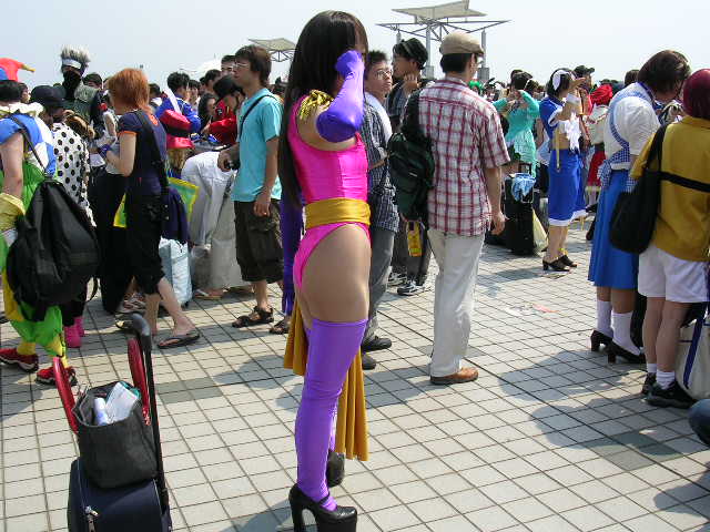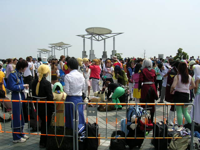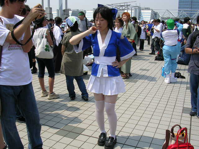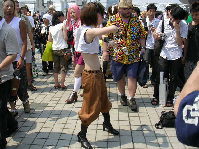 I had been in Japan a few weeks so I had grown used to big crowds, but the sight that met me when we reached the outdoor cosplay area was truly amazing (you can see just what it looked like in Pic 2 at the bottom of the page). Comiket was different from American cons in that you couldn't just take pictures of cosplayers wherever you wanted; it all had to be done in the specified fenced off outdoor area. I have to hand it to the people who stand out there all day and have their pictures taken....the oppressive heat and humidity of a Tokyo summer day was only amplified by standing in a huge crowd of people, and I could hardly imagine staying there any longer than the time I took to snap some random pictures and get out as soon as possible (you can see the pics I took at the bottom with my brand new digital camera....most of them weren't characters I recognized, I just thought they had pretty costumes, and all of them were taken while or slightly after other people took pictures of them, since I was too shy to go up and ask them myself -_-;;) Some of the more popular cosplayers (i.e., those with barely any clothes on :P) even appeared to have handlers who would only let people take pictures of the girls for a specified amount of time before giving them a break (I caught one of them mere seconds before her posing time was over!)