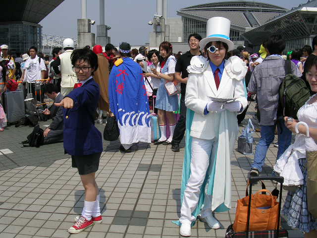 After taking some pics, Lily and I tried to find where the doujinshi were being sold. We weren't really sure where to go, but decided that following the massive blob of people moving into the building would be the best course of action. This turned out to be correct, and we soon found ourselves in one of the three gigantic rooms where thousands of tables were set up for doujinshi circles to sell their works. We really had no idea where to start, so we bought one of the massive 1400 page catalogs that cost 1800 yen. We still didn't really know what to do, so we went to one end of the room called East 1~3 (which, as the name implies, was actually three rooms with all of the partitions removed) and just started browsing through....not a good idea, since before we even got a third of the way through that one room, our eyes were going loopy. We decided to go get some food at the convenience store inside the building and formulate a plan. When we had been wandering through the first room, I had realized from the huge section of Lord of the Rings doujinshi that many of the circles were organized by series, so as I ate my conbini sandwich filled with egg salad and fried pork and who knows what other ingredients that are found only in the unique Japanese take on American sandwiches I looked through the catalog to see if I could find series I would like to get doujinshi for. I didn't really find anything in the part of East 1~3 we hadn't yet searched through (in fact, a full third of the room was devoted to Full Metal Alchemist, which I hadn't yet seen at the time), but East 4~6 had Sailormoon and Gundam stuff, so we made our way over there. I didn't find any yaoi in the Sailormoon stuff (I guess I was holding out hope that I could find some KunzitexZoisite stuff after all these years), so I quickly made my way over to the Gundam area, specifically looking for Gundam Wing. By this time it was after 3PM, and since the doujinshi selling areas close at 4PM, we found that a lot of people were packing up to leave already. Still, I did manage to find some interesting circles that were still set up to sell things, and I ended up buying two Gundam Wing yaoi doujinshi from the circle Mitsuki-C. After that, we were off to the last of the massive rooms, West 1&2, where I looked for Trigun and Detective Conan doujinshi. The Trigun circles had pretty much all left by this point, and when I went to look for Detective Conan, I couldn't decide whether I wanted to read het or yaoi books....I think Shinichi and Ran are a cute couple, but the idea of Heiji and Shinichi is also very tempting ^_^ In the end, I didn't buy either type, deciding I should really know which pairings I liked before buying doujinshi dedicated to them.