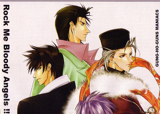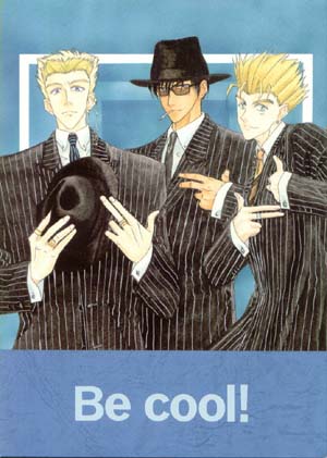 Cover of Be Cool!: Here, we have Vash, Knives, and Wolfwood dressed up as gangsters. They look so sexy (and if you couldn't tell from the fact that I've used it twice already, "sexy" is going to be a very overused adjective on this page ^_^;;).