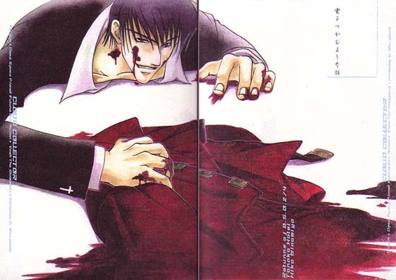 Front and back of Cloud Collector: Creepy looking pic of bloody Wolfwood holding Vash's coat.