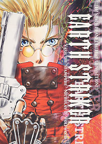 Front cover of Earth Striker: Really cool picture of Vash holding up his gun.