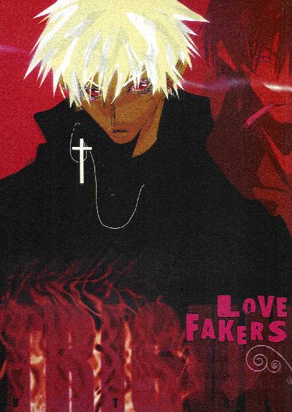 Front cover of Love Fakers: Surreal alternate coloring of Vash with his hair down....neat ^_^