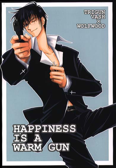 Front cover of Happiness is a Warm Gun: Cool looking Wolfwood winking and pointing his gun.