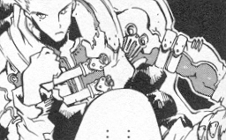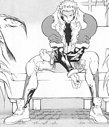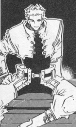 In addition to the outfits shown above, we have seen him as a kid wearing the same clothes as Vash, and he worn a spacesuit...we've also seen him naked ^o^ If you look at all of his outfits, he seems to like big shoulders, coupled with an assortment of straps, buttons, and tubes. I have to wonder where he gets this style of clothes, since everyone else on the planet dresses fairly normally (well, except for Vash...he likes the straps, buttons, and tubes, too ^_^). I guess since he's so old, it's possible that he knows how to sew ^_^ Or maybe his cult followers give his stuff. The biggest question I have about Knives and his outifts is that why does he get so many costume changes while all the other characters seem to be happy wearing the same outfit every day for years on end? Perhaps Nightow-sensei just likes designing stuff for him, because it's more interesting than designing "normal" clothes for the other characters.