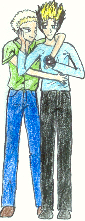 Happy Vash and Knives: Here's a pic of Vash and Knives looking happy as they hold each other. It's only twincest if you want it to be ^_^ I had a lot of problems while drawing this pic, but I'm pretty happy with the end result. Vash seems to be having a bad hair day, however, and they both look younger than I originally intended them to...oh well, it's still pretty cute, I guess ^_^ Drawn November '01