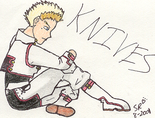 Introspective Knives: Just like the title says, he's just kind of posing and looking introspective here ^_^ This is my first Knives picture, but hey, I've drawn Vash before, and that almost counts as drawing Knives ^_^ His outfit is what he wore when he first met Midvalley and during the July incident in the manga. It was another one of those things where I was like, "I have to draw him wearing that!" Who knows, I might even attempt the scary spiky outfit next (sans freaky mask). Anyway, I really like this pic ^_^ Drawn August '01