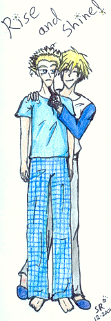 Knives and Vash first thing in the morning: I'm not sure where the idea for this pic came from, but at some point I got the idea that Knives is not a morning person ^_^ So, I decided to draw this pic of zombie-like Knives and perky Vash. I think its's cute ^_^ Drawn December '01