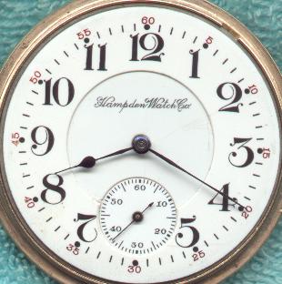 Now, here's where it get's mysterious.... Shugart's "Complete Guide to Watches" lists one 16 size Hampden with the grade name "Chronometer". That particular watch [which just so happens to be a rare, 2-star watch worh as much as $1,000] is listed as having a detent escapement, however, whereas this watch has a standard lever escapement instead. In the back of the listings for size 16 watches, there are a few other possible candidates. There is the "555" grade, which is supposed to be marked "Chronometer" on both the dial and the movement [and is also worth big bucks]. At first, I thought this watch might be a 555 with a replacement dial. But then I heard from a number of watch collectors who said the 555 grade is adjusted to 5 positions, instead of just 3. The next candidate would be the "120" grade. However, that is listed as being marked "Chronometer" on the dial [and presumably not on the movement], whereas this watch is marked on the movement and not the dial! So, this watch is not the "Chronometer" grade, it's not the "555" grade, and I don't believe it is the "120" greade, either. So what grade is it? I really don't know. I do know that it is fantastically accurate whatever grade it might be, and definitely deserves to bear the marking "Chronometer".