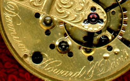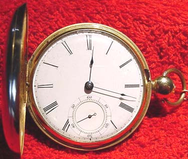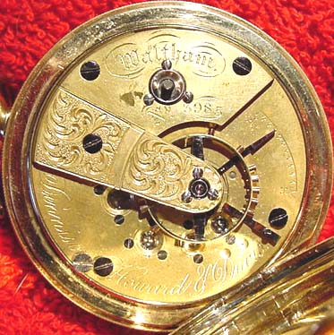 This is a VERY early Waltham pocket watch. Unlike most of my Walthams which have serial numbers well into the millions, the serial number on this watch is only 3,985. which dates it to about 1855 [the company was formed in 1852]. In fact, this watch was actually made when the company was still called the "Boston Watch Company". The watch is an 18 size, Model 1857 and marked "Dennison, Howard & Davis" on the movement. It is key wind and key set, and has 15 sapphire jewels. It is housed in a solid 18-karat gold hunter case which still has some faint engravings left on it.