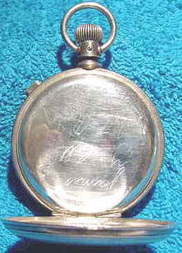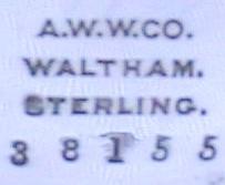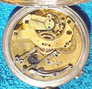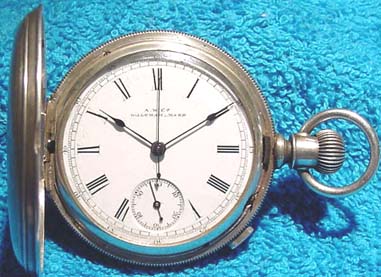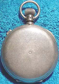 What a watch! This is a very nice [and very hard to find] Waltham chronograph. It is a Size 14, Model 1874 and has 13 jewels. The serial number is 3160627, which dates it to about 1886. It is stem wind and lever set. The chronograph function consists of a center sweep second hand and a button on the side that causes it to start, stop and jump back to zero. The movement is incredibly complex, and what's ESPECIALLY nice about this one is that it is still in its original sterling silver Waltham hunter case.