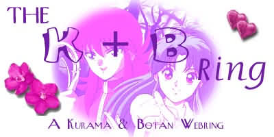 Welcome to the K + B Ring homepage! This is a webring dedicated to Yu Yu Hakusho's Kurama and Botan. If you would like to join this ring, you are most welcome, provided your page (or some part of your page) has content that is either dedicated to Kurama (no yaoi), Botan or both. It can be a profile page, a fanfic page or a fanart page... anything, as long as it's either about Kurama, Botan or the two! :) Do you have a website like that? If so, then, you're on the right track! ^-^