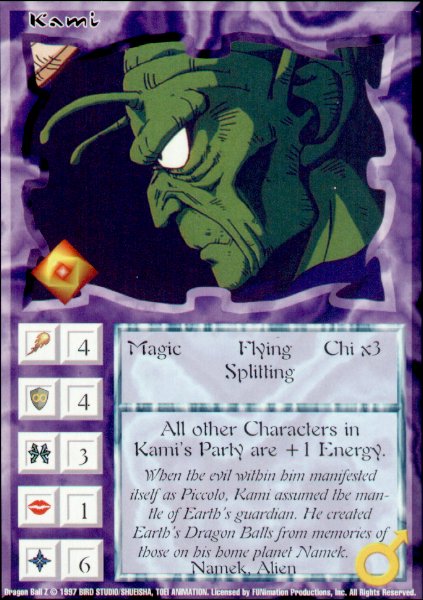 Well, this one came by request, and why not? This man is the king of chi, and vice-king of Energy. Lets go over the stats. 4 Power - Great. 4 Defense - Great. So he's pretty loaded in the war department. Ok, 3 movement, pretty average. Charm, um, this is one ugly dude. He could lose to Baba. Then comes Energy, and he excells almost all on this. Ok, on to skills. This guy only has four, but they are all pretty good. . This is truely awesome. He has the highest Chi and second highest Energy(tie) in the game. Hmmm...isn't there some card that could work with this?:-). Anywho, Flying is pretty much a staple on most DragonballZ cards. Magic is good to have, and Splitting is good for Split Attack. So overally, His stats are very superior too. Most crappy cards are good up to this point, and then say "You must do 40 pust ups in 10 seconds, or you lose the game" in reeeealy small print. Kami is a defenite exception. +1 Energy to all Characters in same Party. Now one would think that the best use for this would be Genki-Dama. It is a great combo, but what I have found it most useful is for Shinseiju Tree. This Minor Disaster is a pain, but with Kami out, it just seems so easy!