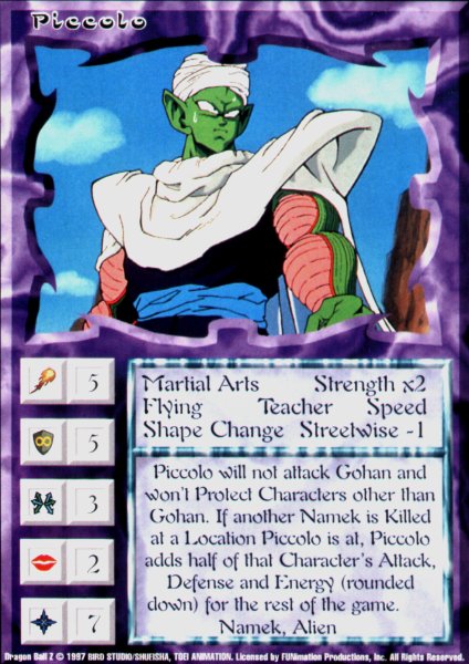 Set: Set 2 - DragonballZ Rarity: Rare And then we have Papa Namek. This guy wails. He's big, bad, ruff, tuff, and all of the above. He excels in almost every category. He is just plain power. Almost a perfect card. But we'll get to that. Stats, stats, stats. This man(er...Namek) is loaded. Five Power and Defense is awesome, and up there with Goku and Adult Gohan. A pretty average movement of three, so he can keep up. As usual, he is ugly, but not as much as Kami or Nail. And then there's his energy. Bam! 7 energy, being the highest in the game, is really powerful, especially with a bad boy such as Piccolo. All in all, this guy is the bomb. Think they used enough room for skills? This man is, again, loaded. Lets check them all out. Martial Arts, of course, is a good thing to have, since a lot of Locations in Ani-Mayhem need it. Strngth x2 is another no-brainer. Just look at those green biceps! Flying - duhee. Teacher, this could get him in trouble with a few Disasters, but it could really help him with a few cards like Mother Instinct. Speed is good for, well, a lot of things. Shape Change is good for Regeneration and Split Form. Then we have Streetwise -1, but that's ok, we don't care how smart he is. Once again, this guy is the bomb, no doubt about it. Then we move on to his game text. I know it's long, just read it. Ok, so he has to guard Gohan, and can't attack Gohan. This could be a problem, but that's what Goku is for, to attack his own son. Then there's that little thing about gaining half the power, defense, and energy of Nameks, but that's nothing huge, but Piccolo will be. With a few Medical Regenerators and Immortality, Piccolo will be a "god". And that's always a plus. So, is this guy worth buying 400 packs of DBZ to get? Probably, but try buying one at a time first. He is soooo close to being perfect, but his charm brings him down a little. Too bad.