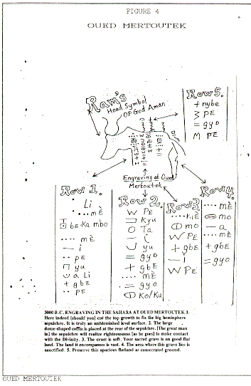 The Oued Mertoutek inscription was found in the Western Sahara (see figure 4). This inscription was found on the lower level of Oued Mertoutek and dated to 3000 B.C. by Wulsin (1941). The Oued Mertoutek inscription like other Libyco-Berber writing is in the Manding (Malinke- Bambara) languages.