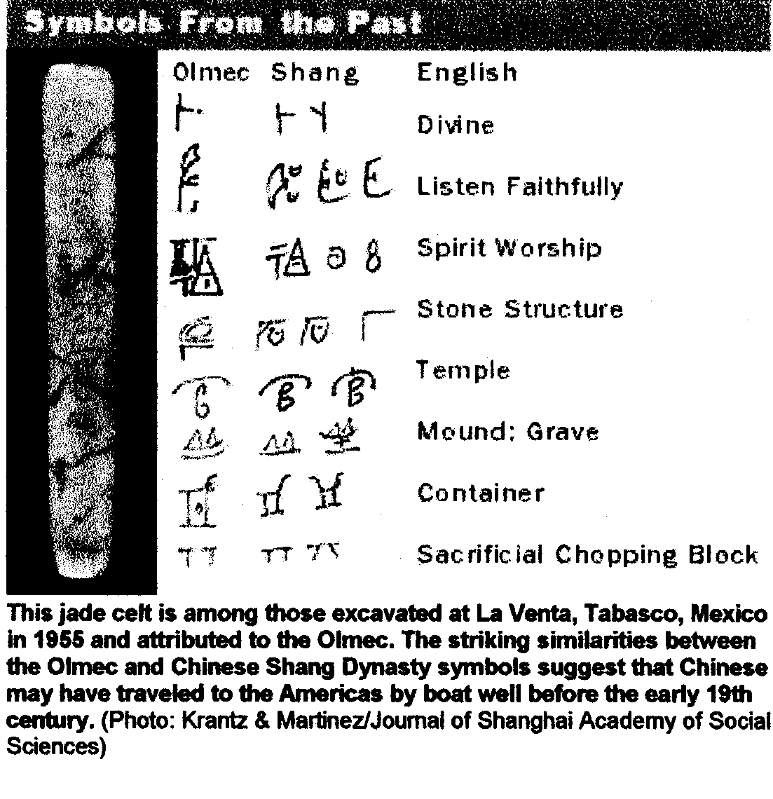 This theory is fine except for the fact that the Olmec writing has little affinity to the Shang writing. Moreover some of the alleged similarities found by Xu do no relate to Shang witing at all. Below is a table of Shang symbols. A careful examination of the Shang table below and the Oracle bone inscriptions above clearly show that none of these signs are identical to the Olmec writing found on the LaVenta celt.