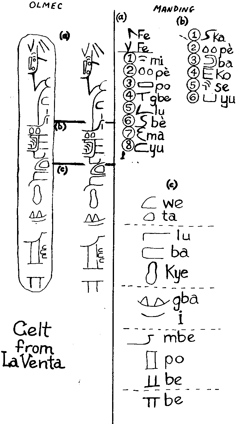 A comparison of the Olmec and Vai (Mande signs) above illustrate correspondence between the symbols. This affinity between Olmec and Mande signs supported the hypothesis of Wiener that the Tuxtla statuette was wriitten in a Mande/Malinke-Bambara language.