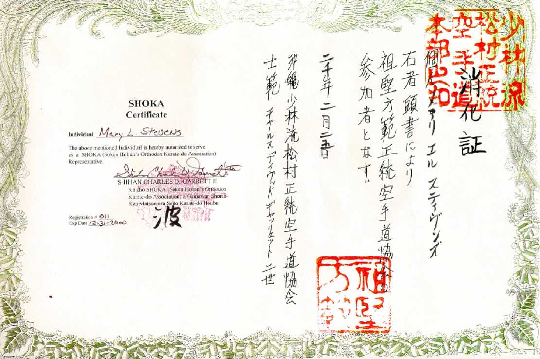 This individual certificate is issued to Mary, one of Shinshii Jesse's Hughes Seito. All seito in SHOKA can have a certificate as this if they like. If your dojo is associated with SHOKA you can get one also. The fee would be $15 per. year. Great to go side by side with promotion certificate. |