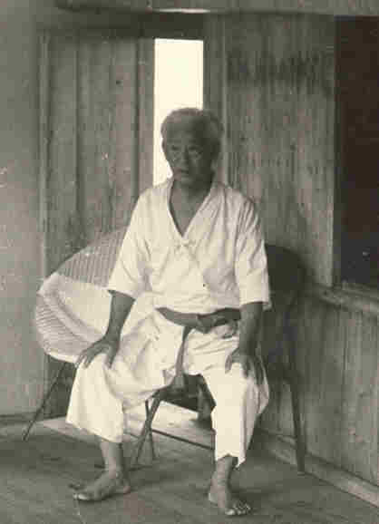| Hohan Soken Shinshii, sitting and observing class. This is the window in which he entered dojo. He utilized this window several times during class. Only 1 time in a year and 1/4, while going into home. Soken's right foot was upon window ceil, and left foot into bedroom. His right foot slipped down towards dojo floor. Soken's gi pants, didn't even touch the windo ceil. His ability at 83 was astonishing. This is what helped Charles Shinshii, to continue the martial arts. | |||||||||||||||||||||||||||