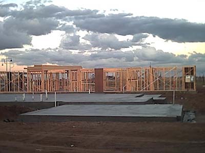Looking from the back of the house, across what will be the meals area jutting out. Note the various stages of other houses in the street.